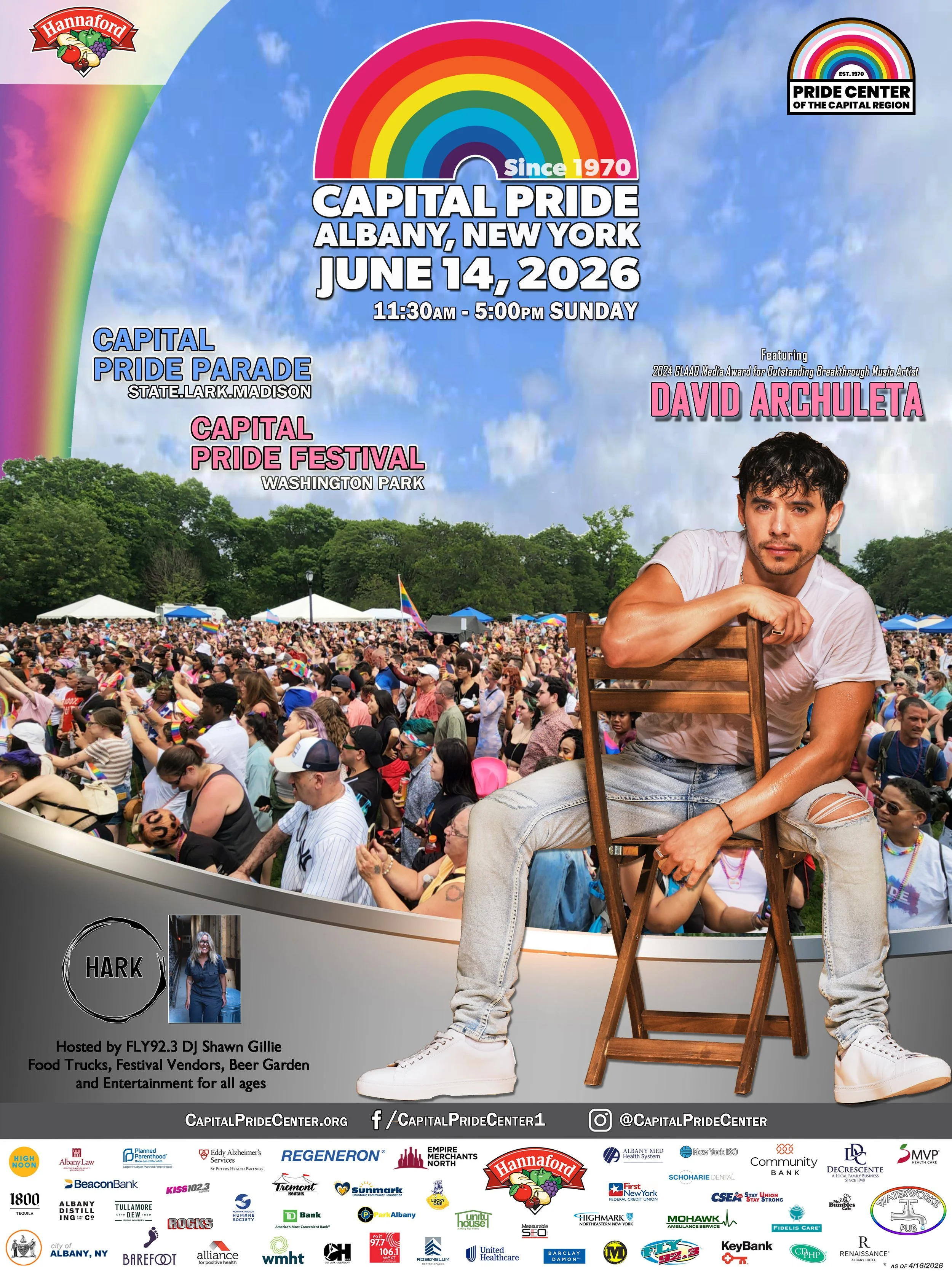 The Pride Center of the Capital Region is excited to announce the 2026 Capital PRIDE Parade and Festival on Sunday June 14, 2026 in Albany's historic Washington Park featuring David Archuleta, the 2024 GLAAD Media Award winner for Outstanding Breakthrough Music Artist. Capital Pride 2026 is Presented by Hannaford Supermarkets.
